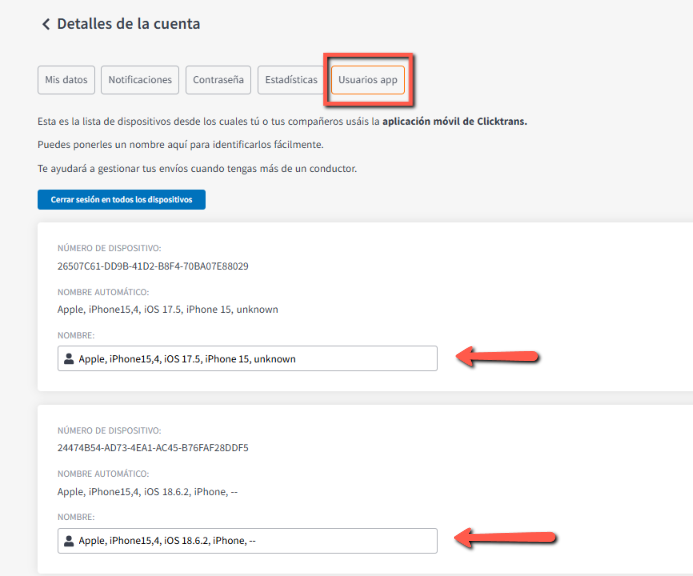 Nombrar los dispositivos que comparten la aplicación "Clicktrans para transportistas"